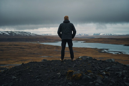 Handsome young man standing in the middle of the Icelandic landscape