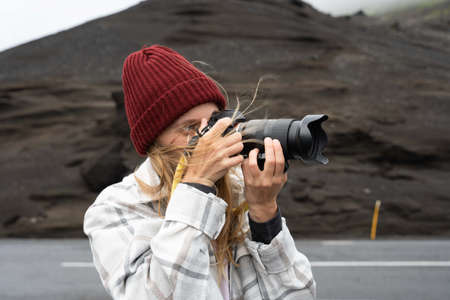 Caucasian woman walking with camera and making pictures of amazing Iceland views