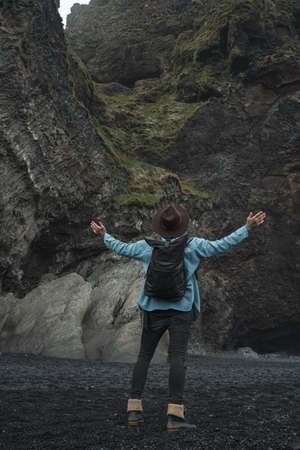 Asian man travel Europe Iceland black beach