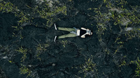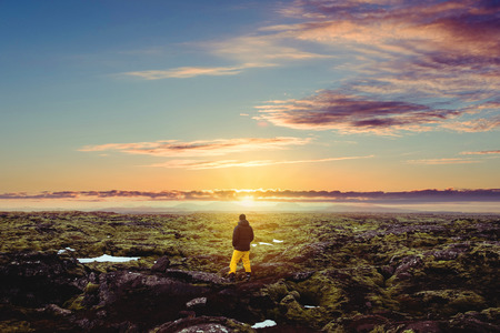 Landscaped mossy lava rock in sunrise with a guy standing alone