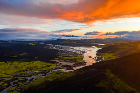 Aerial View of Icelandic Volcanic Terrain at Sunset with Glacial Rivers