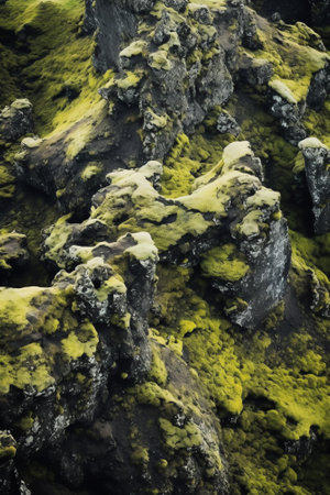 Rugged volcanic rocks in Iceland are covered with vibrant green moss, creating a striking contrast against the dark, textured lava surface