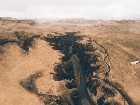 Aerial view of Fjadrargljufur Volcanic Canyon Iceland on moody overcast weather