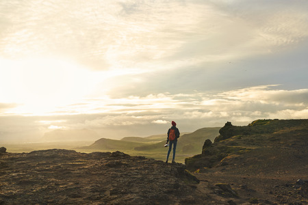 Lone hiker stands on the end of The Horn mountain on Snaefellsnes peninsula in Iceland as golden light from the setting sun illuminates the rugged volcanic terrain below. Stand on the edge.