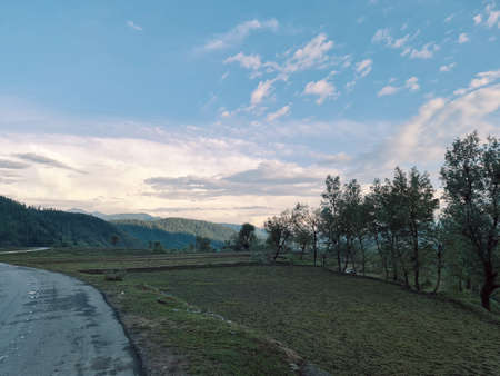 Kashmir beauty green hills forests in mountains. summer landscape with green grass on the hills. nature scenery on a sunny day with clouds on the sky