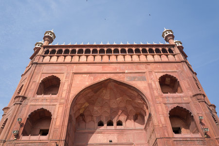 Delhi, India - March 29, 2024: The eastern entrance gate of Jama Masjid mosque is shown in a close-up upward view, highlighting the red sandstone facade, arched openings, and architectural details against a clear blue sky.