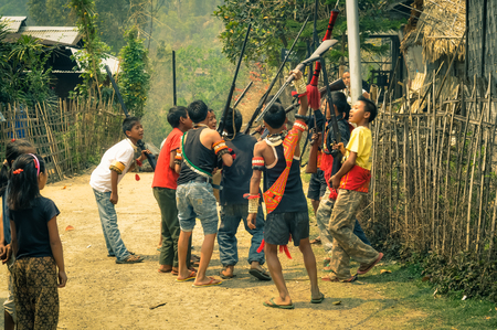 Wanching, Nagaland - April 2012: Photo of group of native boys holding rifles during Aoleang festival in Wanching, Nagaland. Documentary editorial.