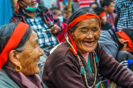 Bohdgaya, Bihar - circa January 2012: Old women with wrinkled faces and red ribbons around their heads smile during teachings in Bohdgaya, Bihar. Documentary editorial.