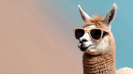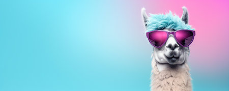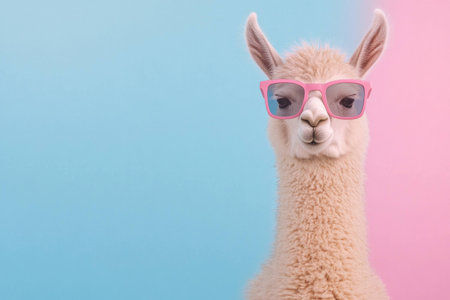 Playful llama wearing pink sunglasses against a pastel blue and pink background, ideal for social media, animal lovers, and creative projects