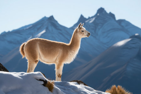 A graceful vicuna surveys its stunning mountain territory. This wild South American camelid stands alertly atop a snow-dusted ridge, embodying the spirit of the rugged Andes.
