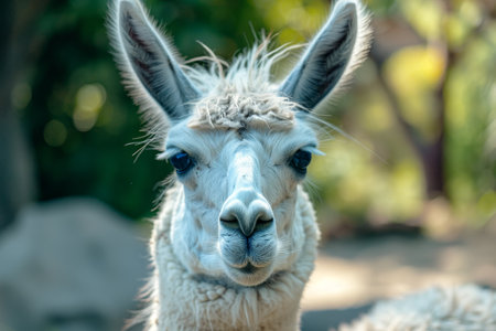 Lama portrait close up image. A funny face of llama with ears upright and big eyelashes in sunny weather on green foliage background