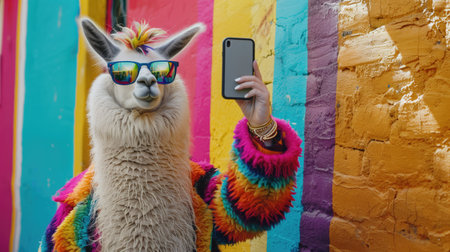 Gorgeous trendy cute llama in colorful ethnic coat and sunglasses takes selfies against a colorful brick striped wall