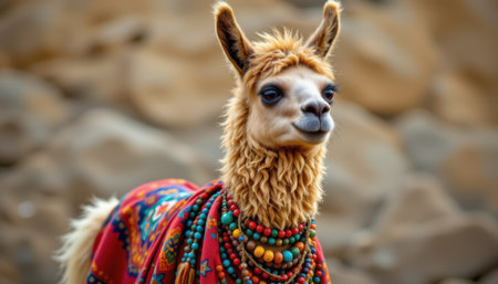charming llama wearing a poncho, adorned with beaded necklaces, in a boho style, vibrant earthy colors, detailed textures, full body composition, high resolution