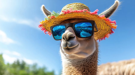 Cute llama looking fab in tropical sunglasses and sunhat, standing under clear skies