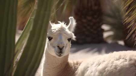 Generative AI image of white alpaca with fluffy fur standing on blurred background