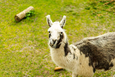 White lama portrait outdoor. Zoo animals. Animals protection and farm life concept. High quality photo