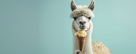 A charming llama holding a coconut and pineapple ice cream cone, sitting against a light blue backdrop. The llama's fur is fluffy, and the ice cream looks tropical.