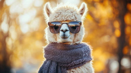 Portrait of a handsome fashionable alpaca. The alpaca is sporting a trendy scarf and sunglasses, posing against a stylish background.