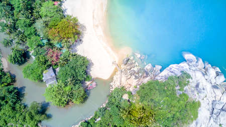 Aerial view of beautiful tropical beach and sea with palm and other tree in koh samui island for travel and vacation