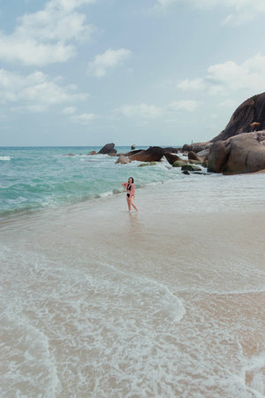 Woman in swimsuit wads in shallow water on tropical beach with white sand, clear water, small waves, rocks, and partly cloudy sky.
