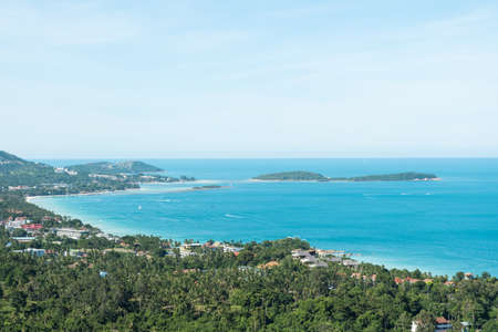 Sea view at Chaweng beach in Koh Samui, Thailand. The scenery of seascape and bay with city and forest of coconut trees in aerial view on summer day.