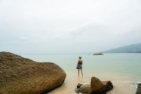 Woman standing on a beach with a rocks and looking to the horizon over sea.