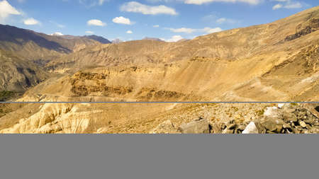 Scenic view between path on Khardung La, mountain pass in the Ladakh region of Jammu and Kashmir. The pass on the Ladakh Range lies north of Leh and is the gateway to the Shyok and Nubra valleys