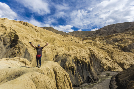 Young male traveler standing on the sand cliff, thinking about or looking forward to something in Leh, Ladakh,India .