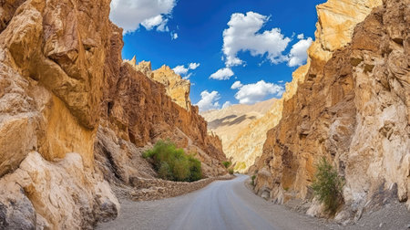 A picturesque road winds through rocky cliffs under a stunning blue sky and fluffy clouds, showcasing the beauty of nature and the allure of adventure.