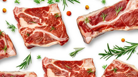 A visually striking arrangement of fresh, raw beef cuts set against a clean white background, perfect for culinary inspiration and food photography.