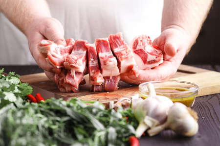 Lamb ribs for grilling or pilaf on a light background with copy space.