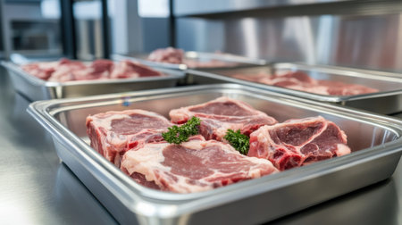 A close-up view of fresh raw meat cuts arranged in stainless steel trays within a professional kitchen setting, emphasizing culinary excellence and food hygiene.