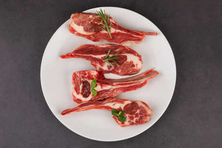 Raw fresh lamb ribs on dark background