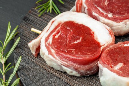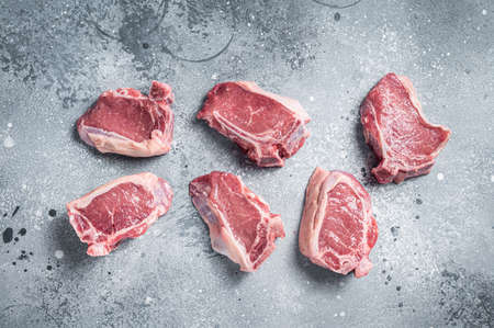 Raw fresh lamb loin chops cutlets. Gray background. Top view