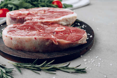 Raw rib-eye beef steak on wooden cutting board on gray background