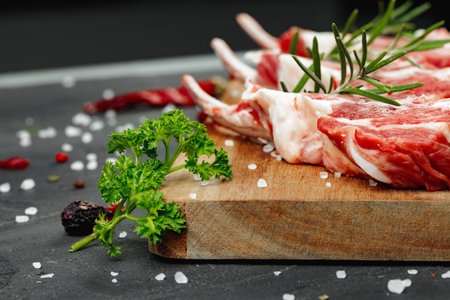 Raw lamb chops or mutton cuts with salt and spices on black stone background. Fresh sheep ribs cutlet with bone on wood cutting board closeup