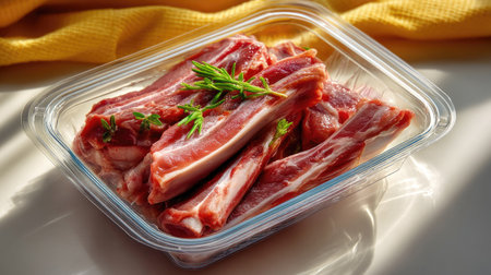 Fresh raw meat chops displayed in a clear plastic container with sprigs of green herbs, illuminated by soft sunlight. Ideal for culinary applications.