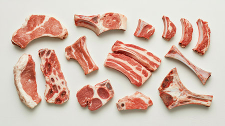 A top-down view of various cuts of fresh pork, including chops and ribs, neatly arranged on a white surface with a focus on their quality and freshness.