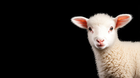 A charming portrait of a cute lamb with fluffy wool and an innocent expression, shown against a dramatic black background, highlighting its natural beauty.