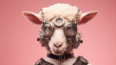 An AI generated illustration of a white sheep wearing a colorful sheep keep and eyeglasses on its face on the pink background