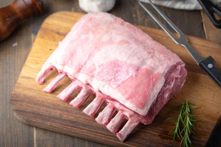 raw lamb rack on wooden cutting board