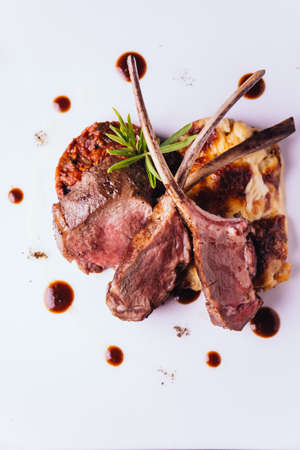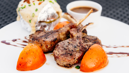 Grilled lamb chop with sauce in white plate