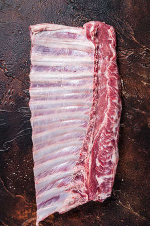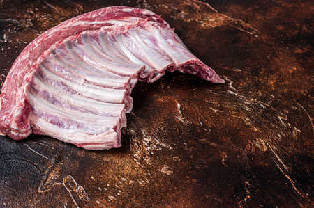 Raw rack of lamb ribs on butcher table. Dark background. Top view. Copy space
