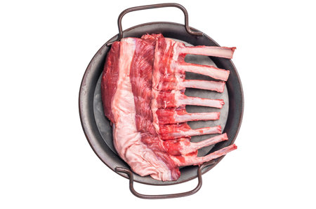 Fresh rack of lamb, raw mutton meat for chops steaks on steel tray isolated on white background. top view.