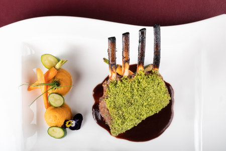 Piece of lamb rack with bone roasted with green herb, bread, cheese crumbs cover, served with sweet potatoes puree and baby vegetables, red wine sauce, in a restaurant elegant setting, on white plate