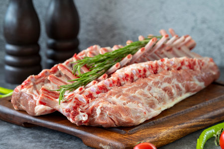 Raw fresh lamb ribs on dark background