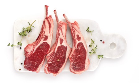 Cutlet or rack of lamb chops isolated on a white studio background.