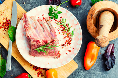 Appetizing raw lamb rib and spices on the kitchen table. Uncooked meat lamb