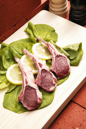 Raw lamb chops with lemons and lettuce on a wooden board.