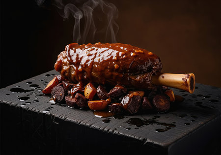 Slow braised lamb shank covered in a thick, glossy brown sauce, resting on roasted root vegetables served on a dark slate board. dramatic low key food photography.